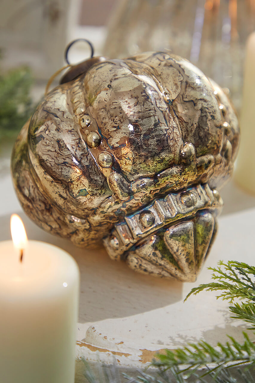 Add a touch of vintage elegance to your tree with our5" Regal Beaded Antique Gold Glass Ornament. The intricate beading and mercury glass finish create a dazzling play of light that evokes the charm of yesteryears. Hang it with care to infuse your holiday display with timeless allure.
