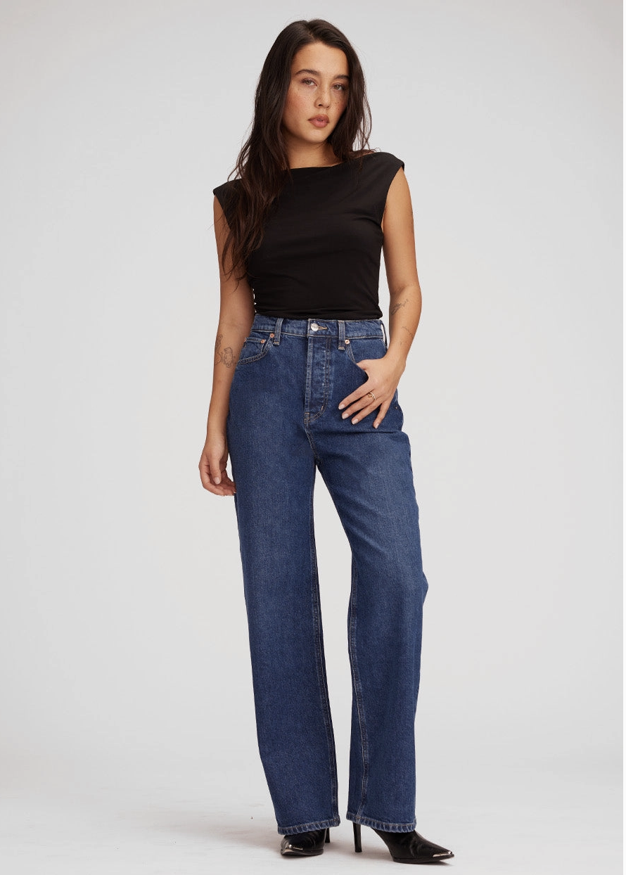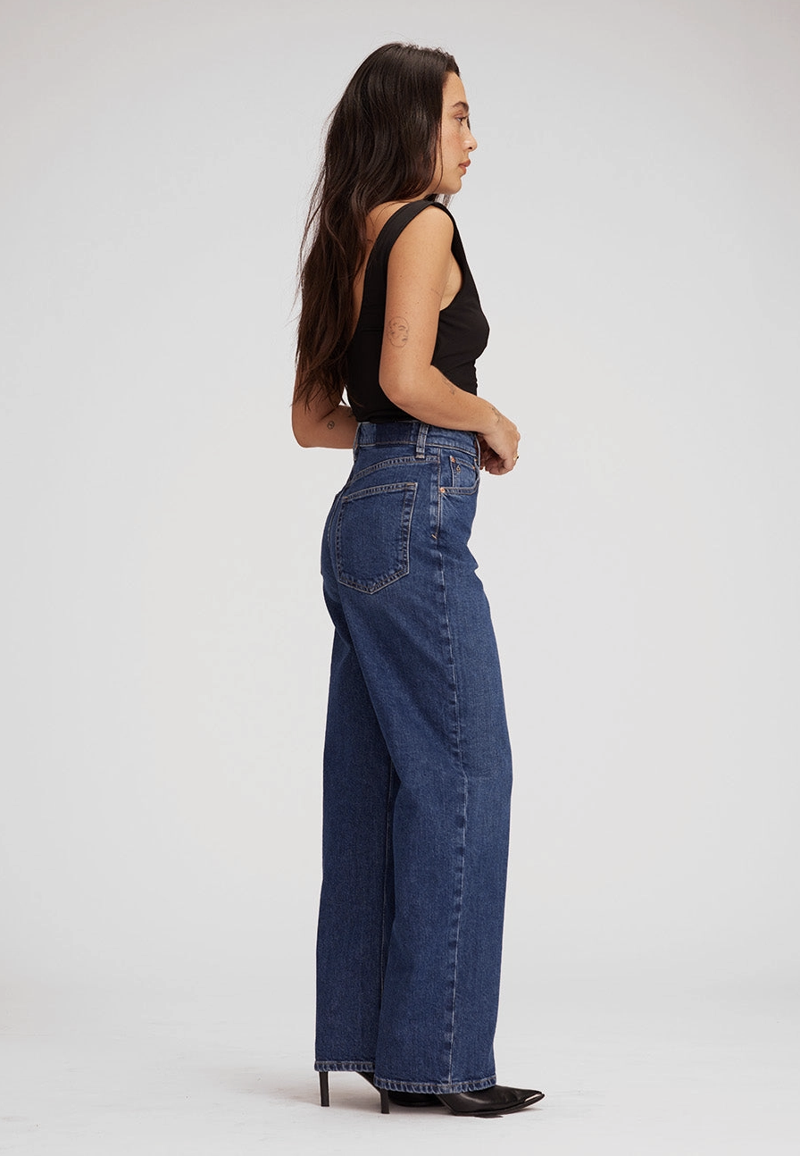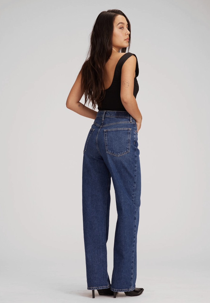An Ultra high-rise loose fit with a button fly that sits higher on the waist, then relaxed through the hips and loose through the thigh and leg.