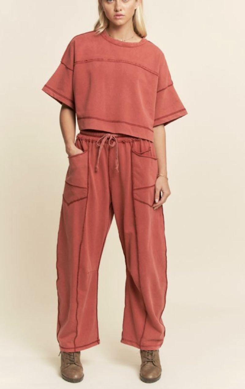 Elevate casualwear with this mineral washed two-piece set, featuring a relaxed boxy top and barrel pants with exposed seam detail. The elastic drawstring waist and oversized cargo pockets bring comfort and function, while the washed finish adds a lived-in, boutique-ready edge. A versatile lounge-to-street look that is effortless for layering or standout styling.