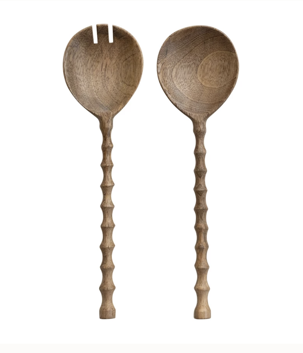 11-1/2"L Mango Wood Salad Servers w/ Carved Handles, Natural, Set of 2