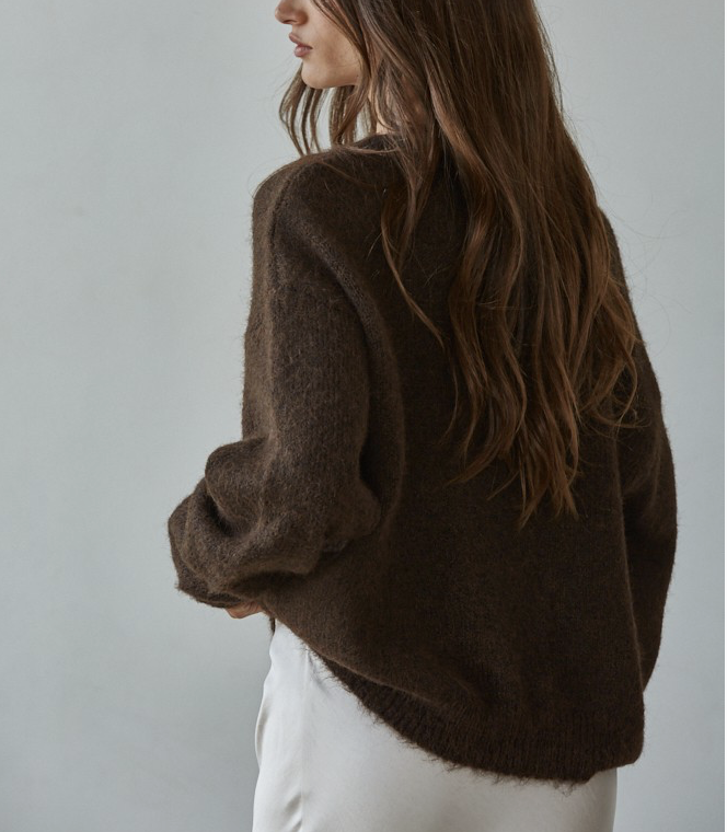 Knit chocolate button down cardigan with cream buttons. Boxy fit, and a bit oversized.