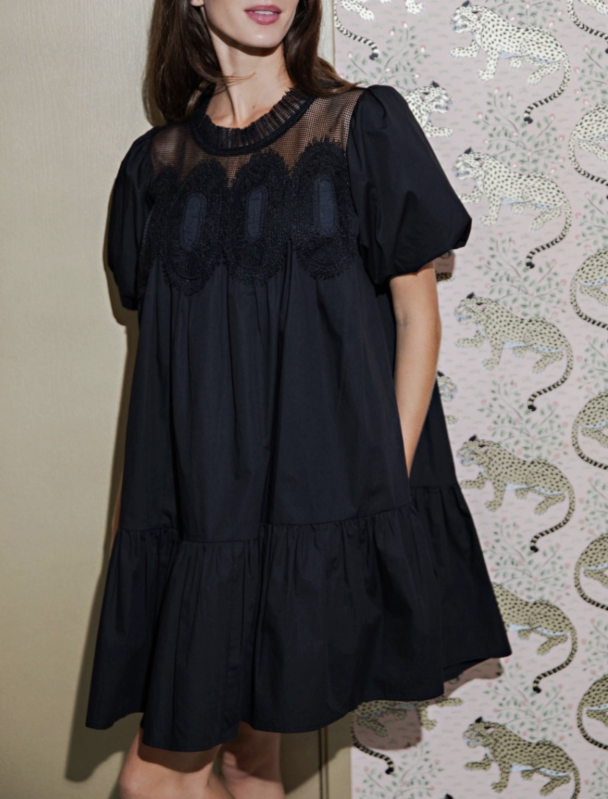 This black cotton babydoll dress features a sheer lace yoke for a romantic touch. Designed with puff sleeves and a gathered tiered skirt, it’s a boutique-ready piece that transitions easily from day to night.