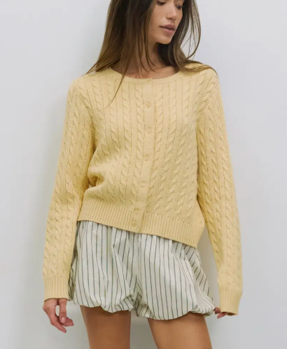 The Dalia Cardigan is crafted from midweight 100% cotton with a relaxed fit, featuring a crewneck, long sleeves, and a full front button closure.