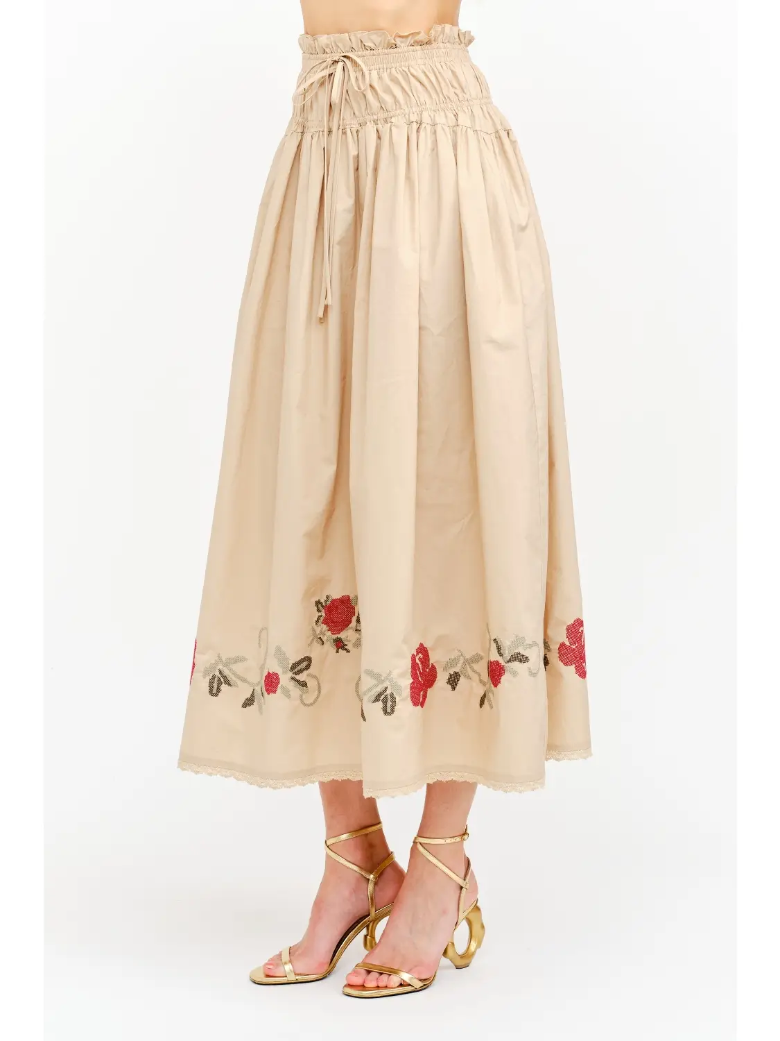 The Eliza Skirt is a charming blend of vintage romance and modern femininity, this embroidered midi skirt is a standout piece for any season. Crafted with a smocked waistband for a flattering high-rise fit, it features delicate ruffle trim and a soft A-line silhouette that falls gracefully below the knee. The hemline is beautifully adorned with bold floral embroidery, adding just the right touch of artisan detail.