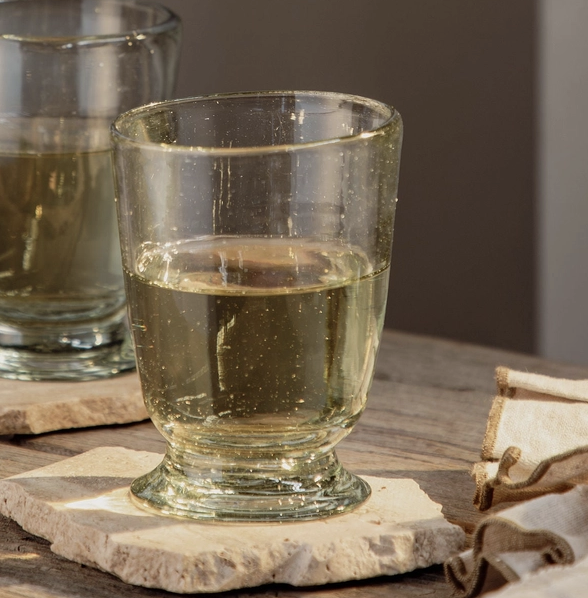 Handblown from recycled glass, these lovely vessels will soon become your new favorite for serving up water, wine, tea and more. KINDLY NOTE: Due to the handmade nature of this item, there will be variations in design and size, as well as slight imperfections, possibly in the form of air bubbles, black specks, pontil and or hand tooling marks, glass or color pattern irregularities; this imperfections are an attribute of handmade craftsmanship and one of the many reasons we love it. Tall glass: approx. 3" Dia x 5.5"H - Sold individually - 100% Recycled Glass - Food safe - Size & shape will vary (approximately 1/2") from piece to piece. - Dishwasher safe. - Not microwave or oven safe Handmade in Mexico