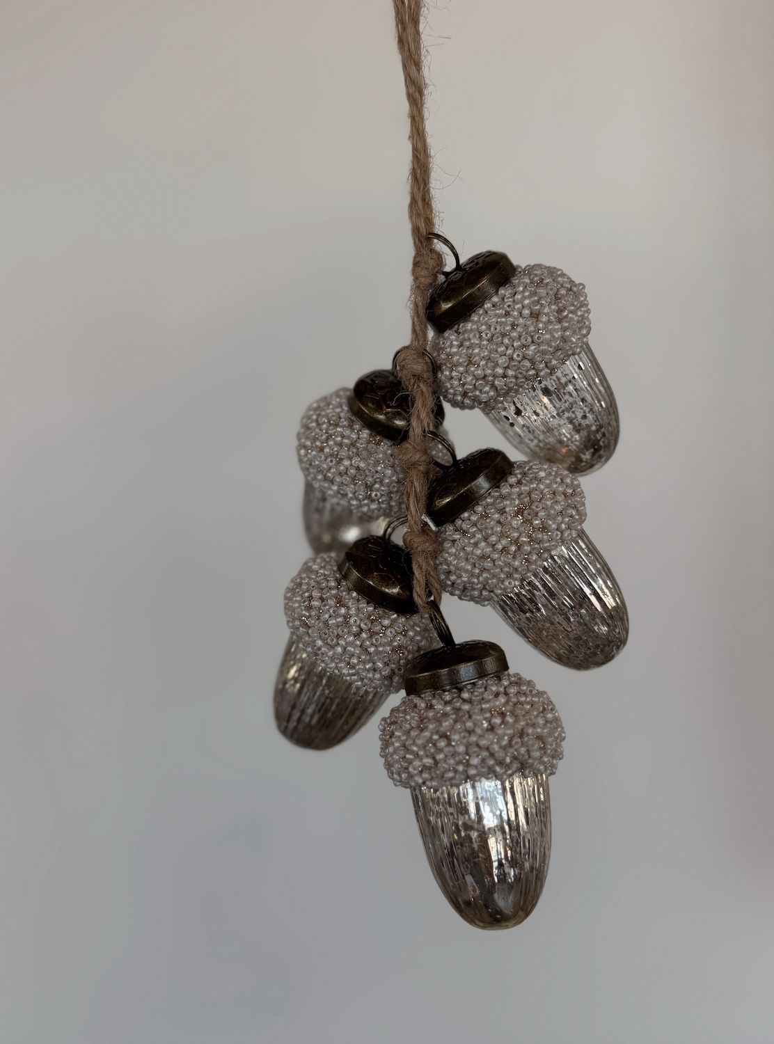 The mercury glass acorn cluster of 5 on a burlap string adds a linear layer to your Christmas tree or fills a festive bowl on the coffee table.