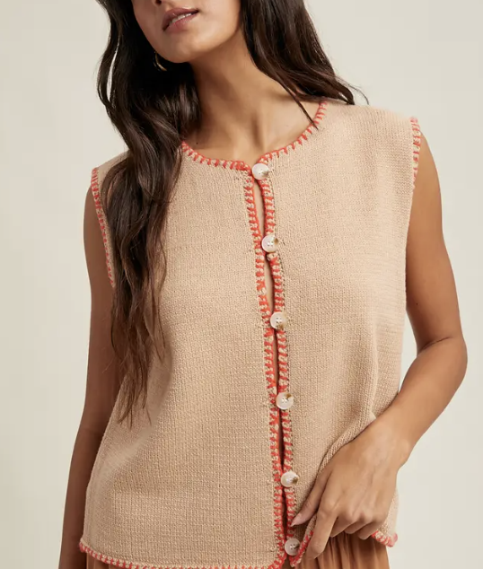 Our Nelly Sweater vest has a crew neck, button front, and unique contrasting stitch detail.