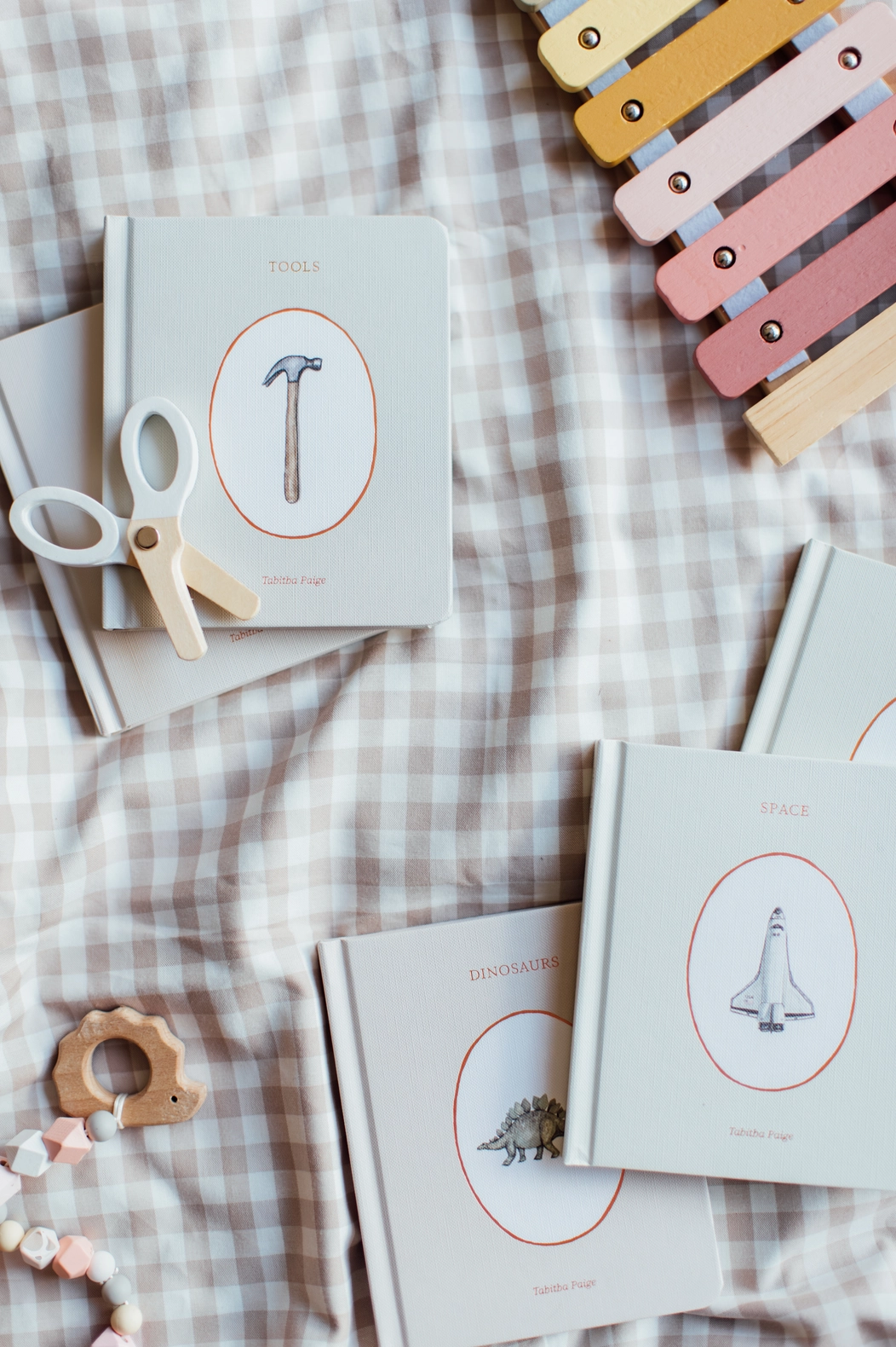 Our Little Library Vol. 3 is a premium board book set designed by licensed speech therapist and watercolor artist, Tabitha Paige. Featuring hand-painted illustrations and curated first words in categories like Sports, Space, Dinosaurs, Tools, and Bugs, each book supports early language development with a fun “seek and find” activity on the back pages.