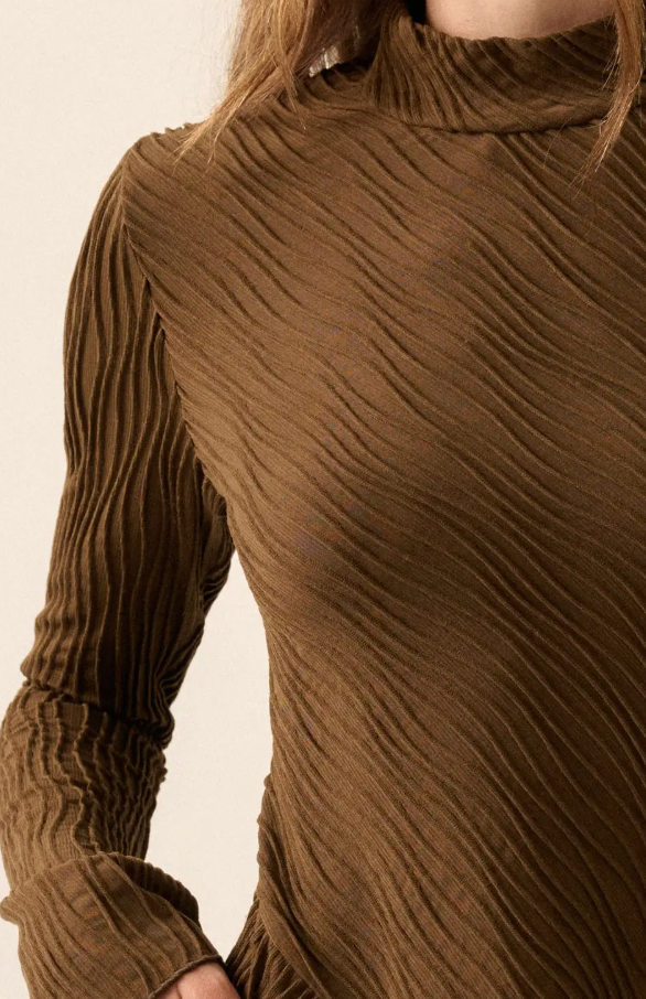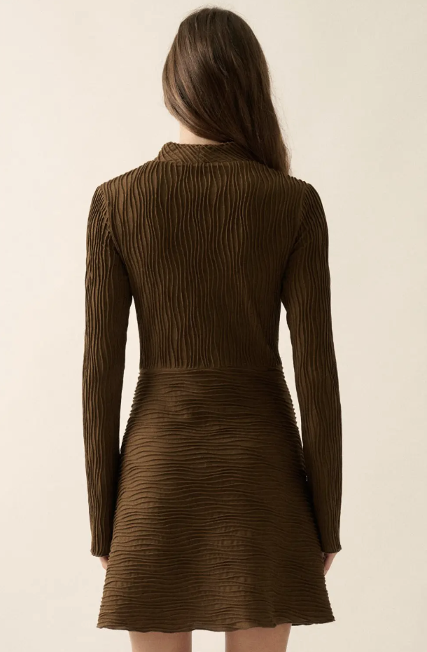 Our Rowan Dress is a soft rib-kni dress in rich chocolate with subtle wavy texture and a flattering, easy A-line fit.