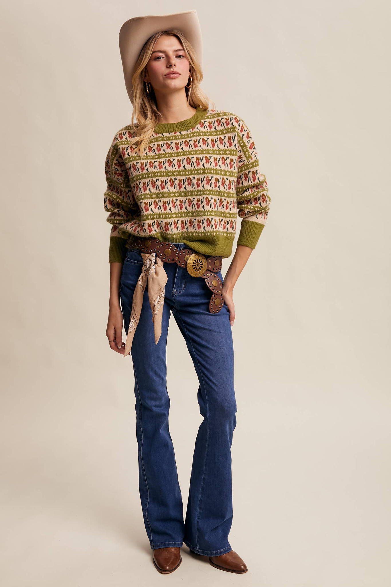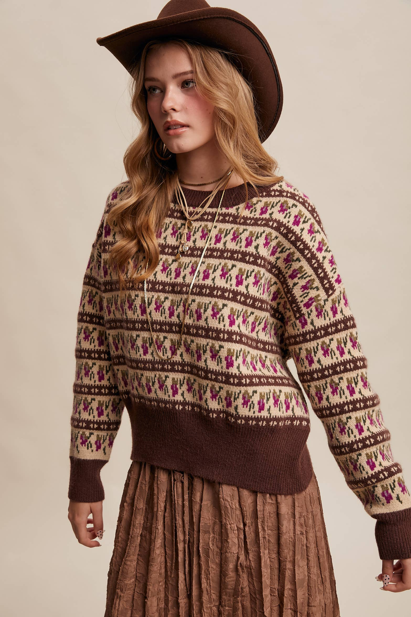With its desert-patterned knit and cozy weight, this sweater effortlessly blends Western nostalgia with modern layering-perfect for styling with jeans, cargo pants, or even tucked into a midi skirt for a polished boho look.