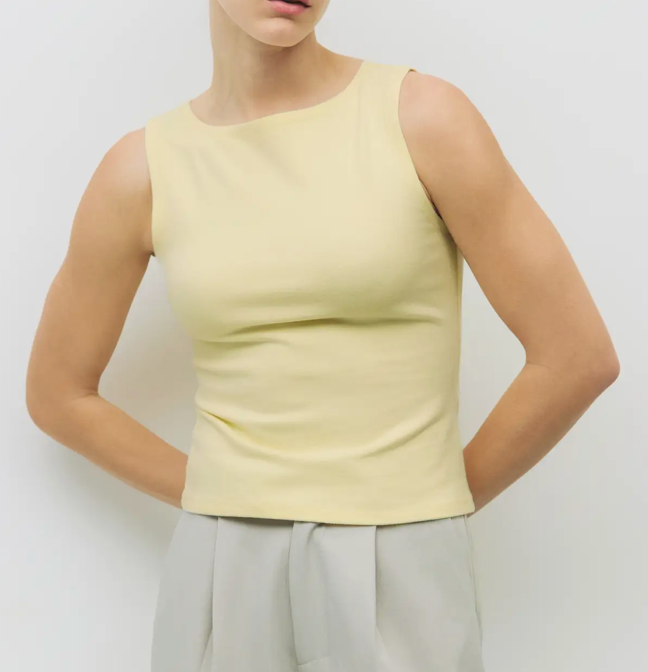 The Sidney Top is a form-fitting brushed knit top with a sleek boat neck in Butter Yellow. Its semi-cropped length makes it an easy piece to pair with high-waisted bottoms for a modern look.