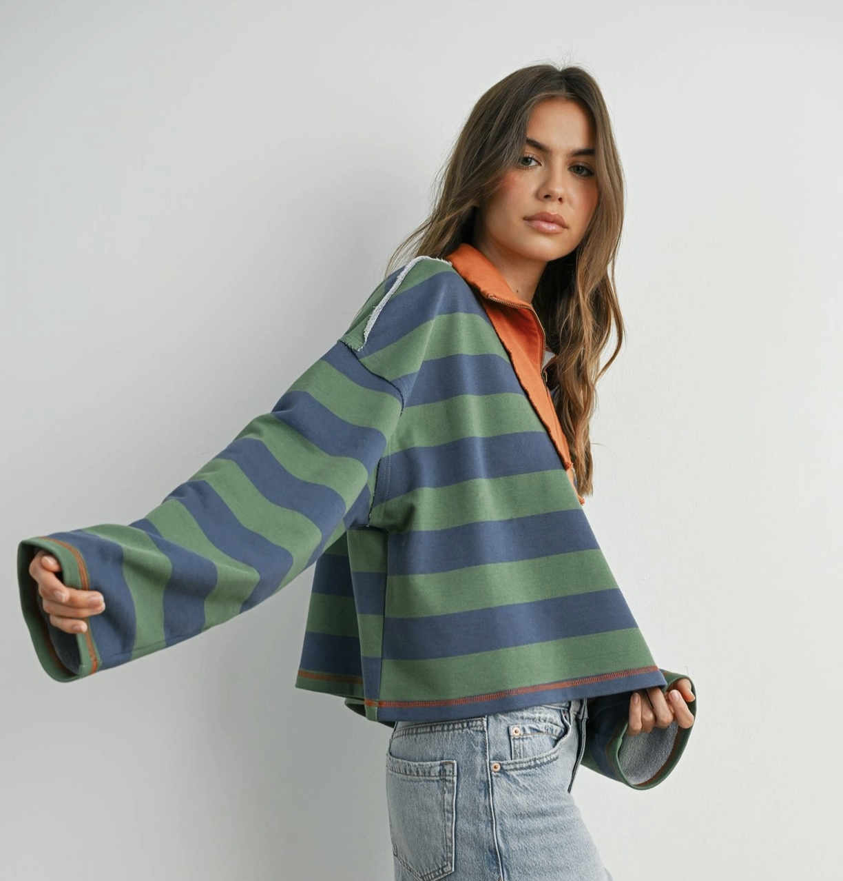 The Striped Quarter-Zip Contrast Collar Sweatshirt combines classic design with a modern twist. Featuring bold stripes and a contrasting collar, this sweatshirt adds a pop of style to your casual wardrobe. The quarter-zip detail offers versatility and comfort, while the soft, cozy fabric ensures all-day wearability. Perfect for layering or wearing on its own, it's a go-to piece for effortlessly cool and comfortable looks.