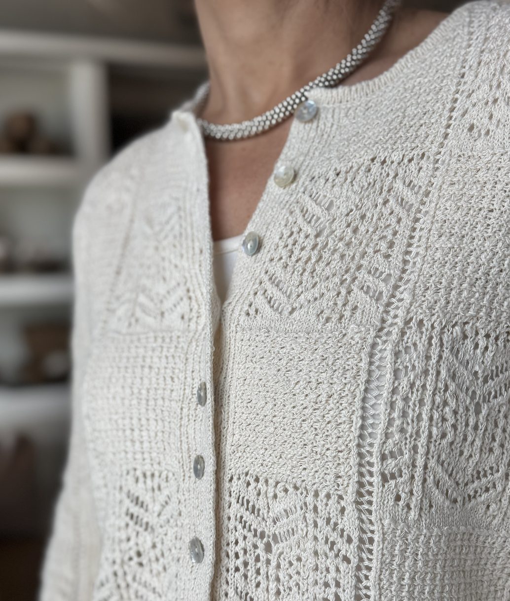 This crocheted sweater with mother of pearl buttons drapes loosely but elegantly. The scalloped sleeves are long and graceful. Fits true to size.