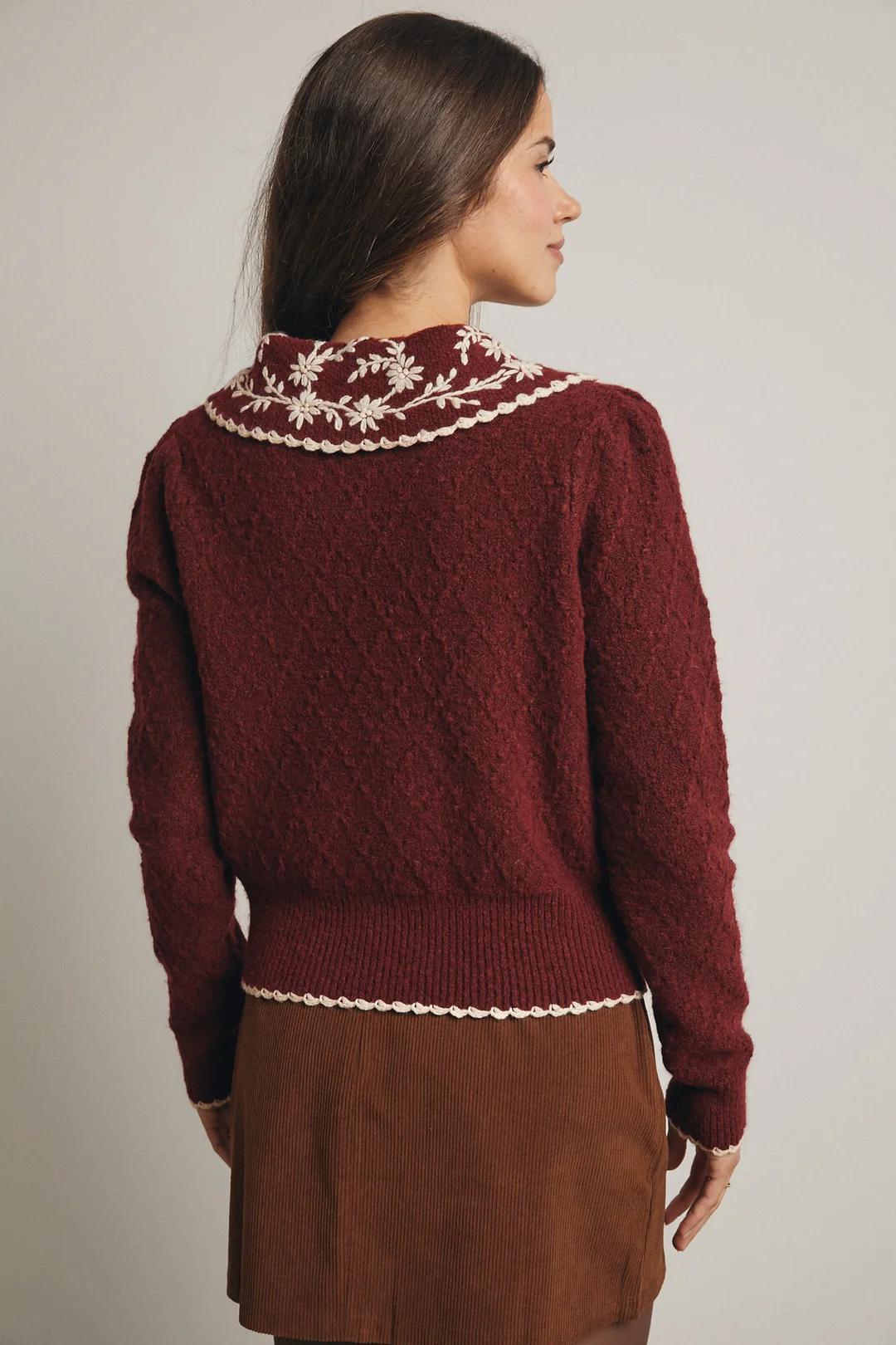 Burgundy pullover sweater with fold over collar that is embroidered with ivory flowers. This sweater is long sleeve and reaches past the waist.